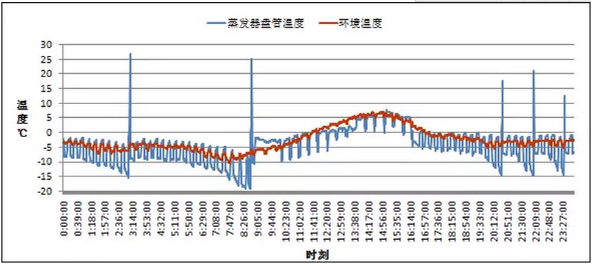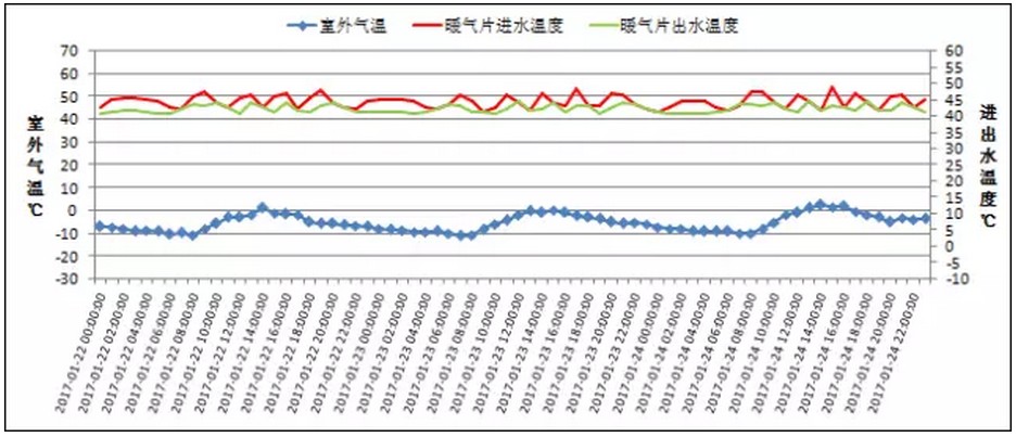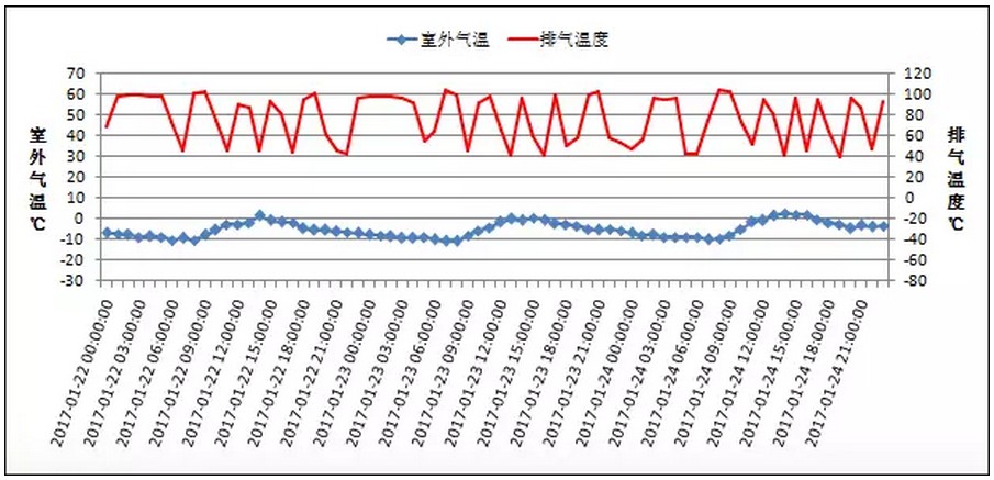 數(shù)據(jù)顯示這三天時間日平均氣溫-5℃~-6.3℃,最低氣溫-12.2℃,最高氣溫2.9℃,室內(nèi)溫度始終維持在18.5~21.2℃,機(jī)組出水溫度43~48℃,機(jī)組回水溫度41~45℃,出回水溫差基本穩(wěn)定在3℃,壓縮機(jī)運(yùn)行排氣溫度最高103.6℃。