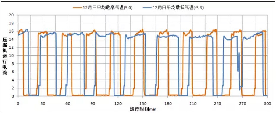 同時從Fig.9看出氣溫低的階段,機(jī)組的開機(jī)時間(制熱時間)增加66.7%,停機(jī)間隔減小,【熱泵市場 水印】總的開停機(jī)循環(huán)時間基本相同,反映低環(huán)境溫度下機(jī)組制熱時間,耗費(fèi)電量將會大幅增加。