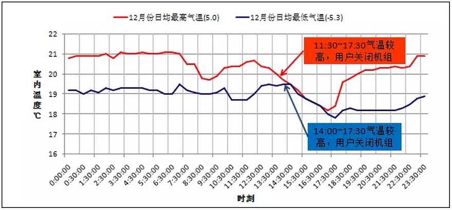 以2016年12月為例,選取日平均最高的一天12月1日,日平均氣溫5.0℃,和日平均最低的一天12月30日,日平均氣溫-5.3℃。兩天日平均差異達(dá)到10.3℃,室內(nèi)平均氣溫差距僅為2℃.