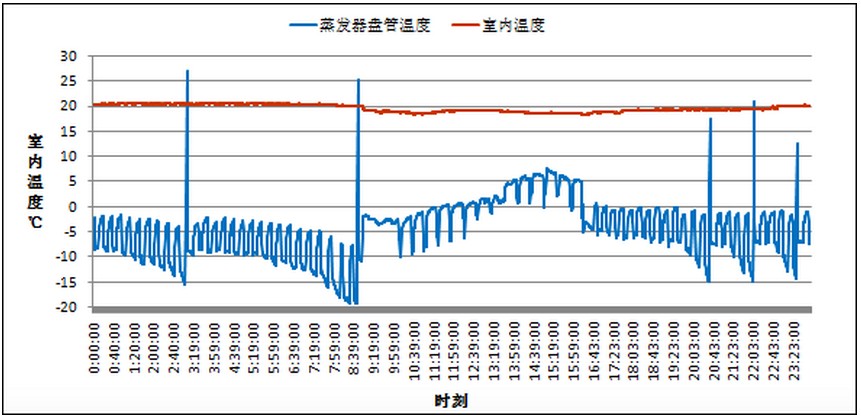 本文選取了2016年12月19日這一天重霧霾天氣,北京市發(fā)布了霧霾橙色預(yù)警并進(jìn)行了交通限行。由于北方冬季氣溫低,霧霾、下雪天氣多,極容易造成空氣源熱泵蒸發(fā)器大面積結(jié)霜,影響制熱效果。從本次監(jiān)測中選取重霧霾天氣,濕度高,同時氣溫-4℃~8℃也是機(jī)組容易結(jié)霜的階段。