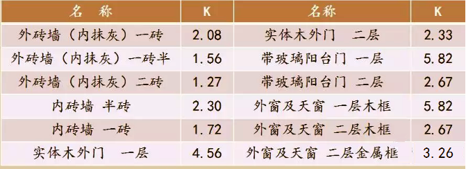 常用圍護結(jié)構(gòu)傳熱系數(shù)K(W/(㎡.℃))