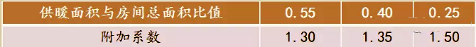 6、局部地面輻射供暖系統(tǒng)熱負(fù)荷,可按整個房間全面輻射供暖所算得的熱負(fù)荷乘以該區(qū)域面積與所在房間面積的比值和下表中所規(guī)定附加系數(shù)確定。