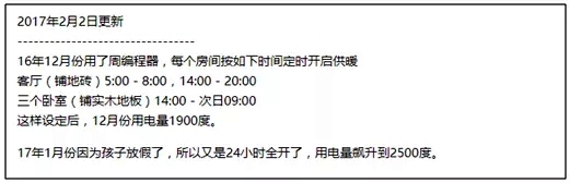 16年12月份每個(gè)房間分時(shí)開啟供暖。客廳(鋪地磚)5:00 - 8:00,14:00 - 20:00;三個(gè)臥室(鋪實(shí)木地板),14:00 - 次日09:00。這樣設(shè)定后,12月份用電量1900度。