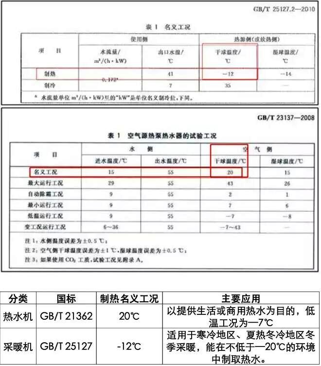 空氣源熱泵熱水器(GB/T 21362)側(cè)重于熱水,設(shè)計(jì)工況干球溫度20℃,進(jìn)出水溫15-55℃,最高水溫60℃,不適用于寒冷地區(qū)、夏熱冬冷地區(qū)冬季采暖。