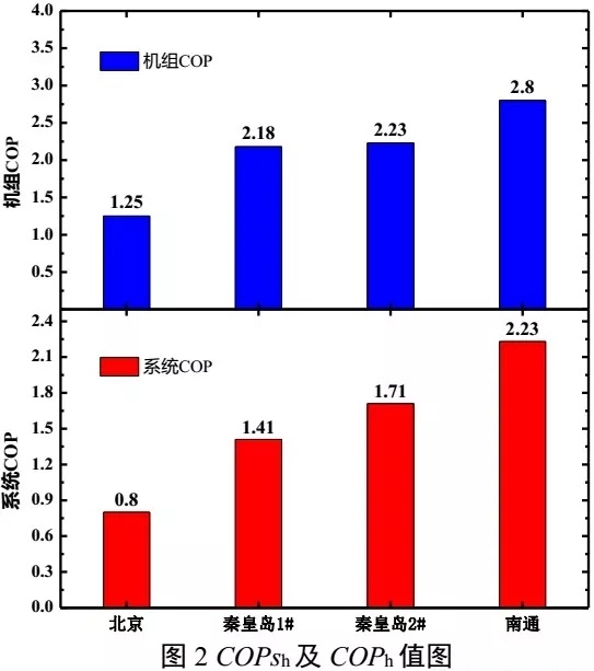 COPsh值更是顯著降低,北京某辦公樓的COPsh值僅為0.8,秦皇島1#辦公樓、2#辦公樓COPsh值分別為1.41、1.71,南通某辦公樓由于COPh值相對較高,COPsh值達到了2.23?梢姡{查的4個綠色建筑空氣源熱泵系統實際運行效果不佳。