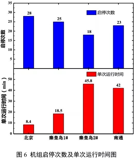 圖6為各項目空氣源熱泵機組啟停次數以及機組平均單次運行時長。北京某辦公樓、秦皇島1#辦公樓、2#辦公樓、及南通某辦公樓項目機組每日啟停次數分別為28次、25次、18次、23次,機組平均單次運行時長分別為8.4min、18.5min、45.8min、42min?梢,實際運行中空氣源熱泵系統存在機組啟停頻繁問題,北京某辦公樓、秦皇島1#辦公樓項目機組單次運行時長過短,嚴重影響機組性能和供暖效果。