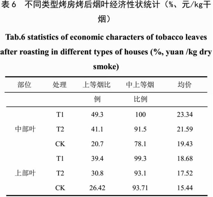 從表6可以看出,處理T1烤后煙葉的上等煙葉比例、中上等煙葉比例和均價最高,對照最低,處理T2除上部葉中上等煙比例比對照CK略低,其余指標均高于對照CK,低于處理T1。其中處理T1中部葉分別比對照提高了28.6%、21.9%和3.91元/kg干煙,比處理T2提高了8.2%、8.5%和1.75元/kg干煙;上部葉葉分別比對照提高了12.98%、5.59%和3.24元/kg干煙,比處理T2提高了8.6%、6.2%和1.16元/kg干煙。