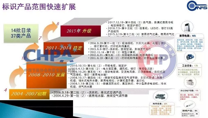 目前國家的節(jié)能標準有300余項(不含工程建設(shè)標準),其中強制性標準約占60%,其余為推薦性標準。重點包括:強制性能耗限額標準106項強制性能效標準65項。依據(jù)能效標準,我國于2004年正式實施了強制性能效標識管理制度,到目前為止已經(jīng)發(fā)布14批目錄,有37類產(chǎn)品納入到了能效標識的目錄范圍。