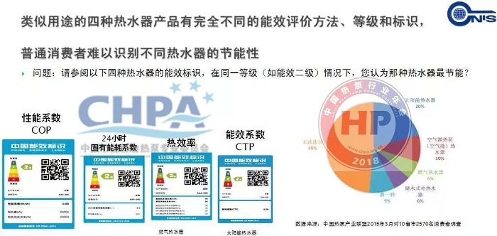 依據(jù)國家能效標準,我國已經(jīng)實施了燃氣熱水器、電熱水器、太陽能熱水器和熱泵熱水器的能效標識,但類似用途的四種熱水器產(chǎn)品有完全不同的能效評價方法、等級和標識,普通消費者難以識別不同熱水器的節(jié)能性。根據(jù)2015年中國熱泵產(chǎn)業(yè)聯(lián)盟針對消費者調(diào)查,49%的消費者表示只觀察同樣標注了2級的四種產(chǎn)品的標識,無法比較哪一個產(chǎn)品更節(jié)能。