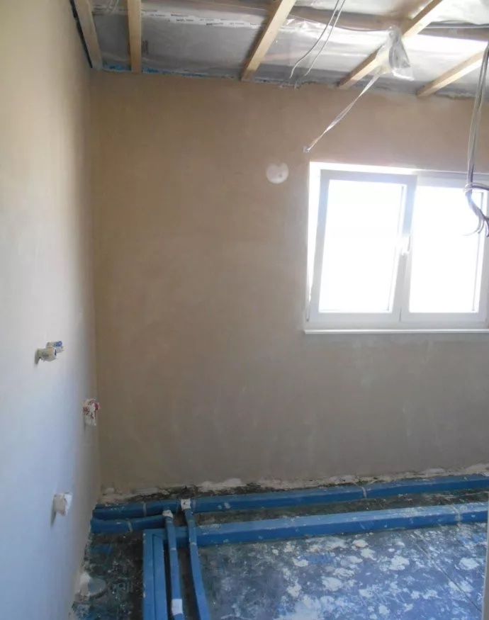 室內“地暖地面”,構造施工現場?梢姡總房間的踢腳線位置,已經圍貼了1層起隔離和地板膨脹緩沖作用的邊角保溫條。實際上,在特厚的硬質泡沫保溫板的上部,事先還鋪設了1層反射膜膜,然后,才布設的類似PEX材質的地暖管線,后續施工,將現場澆注專用地面砂漿。