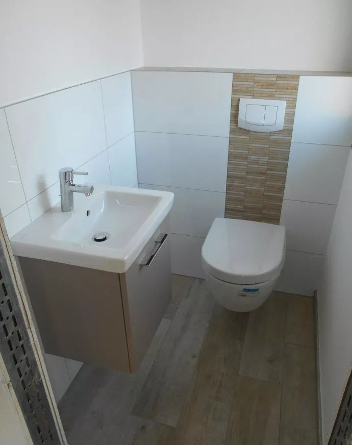 廁所內部一瞥,可見,安裝有懸掛式坐便器、懸掛式洗面臺