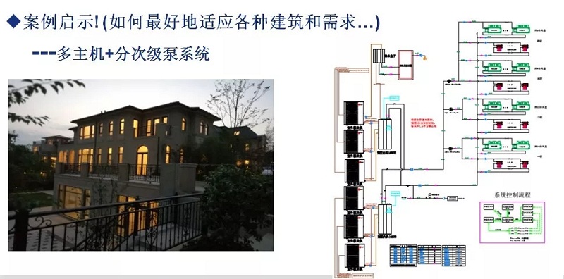 下圖是我們?cè)诤贾莸囊粋(gè)大別墅案例,就采用了多主機(jī)+分次級(jí)泵系統(tǒng),空氣源熱泵可以和末端直接通迅對(duì)接同時(shí)控制對(duì)應(yīng)能力的壓縮機(jī)和次級(jí)泵的輸出,這里面運(yùn)用了很多感應(yīng)的技術(shù),用戶對(duì)現(xiàn)在這個(gè)系統(tǒng)總體上還是非常滿意的,特別是我們解決了極低負(fù)荷下(如只有兩人在家開(kāi)一個(gè)房間的制冷)時(shí),水泵輸送功耗的問(wèn)題,在大別墅里10%以下的低負(fù)荷運(yùn)行占據(jù)90%以上的時(shí)間比,因此,低負(fù)荷下的能效比對(duì)用戶而言就非常關(guān)鍵!目前我們的技術(shù)平臺(tái)完全支持個(gè)性化的要求,這是我們智能熱泵能做到的。